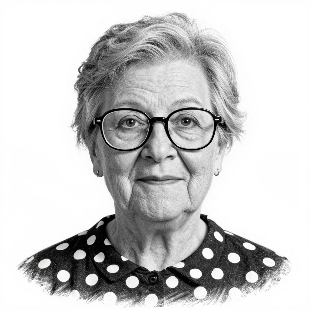 Black-and-white portrait of elderly woman with short, wavy hair, wearing glasses and polka-dot top, against a white background.