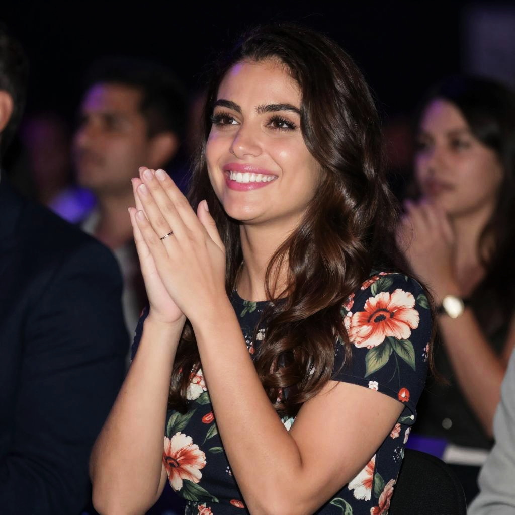 Portrait of a young woman with long, wavy brown hair wearing a floral-patterned short-sleeve top, smiling and clasping her hands near her face. The background is dimly lit and blurred with other people visible. The woman has bright pink lips and visible white teeth, suggesting a happy and engaged mood.