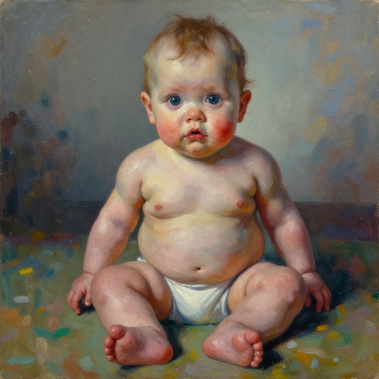 Photorealistic oil painting of a chubby, fair-skinned baby with blue eyes, sitting on a colorful, textured floor, wearing only a white diaper