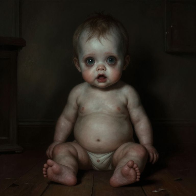 The ugliest baby in the world portrayed as a caricature with exaggerated disproportionate limbs and facial features, grim but colorful palette, surreal absurdity, painterly style, emphasizing discomfort and intrigue in an artistic manner