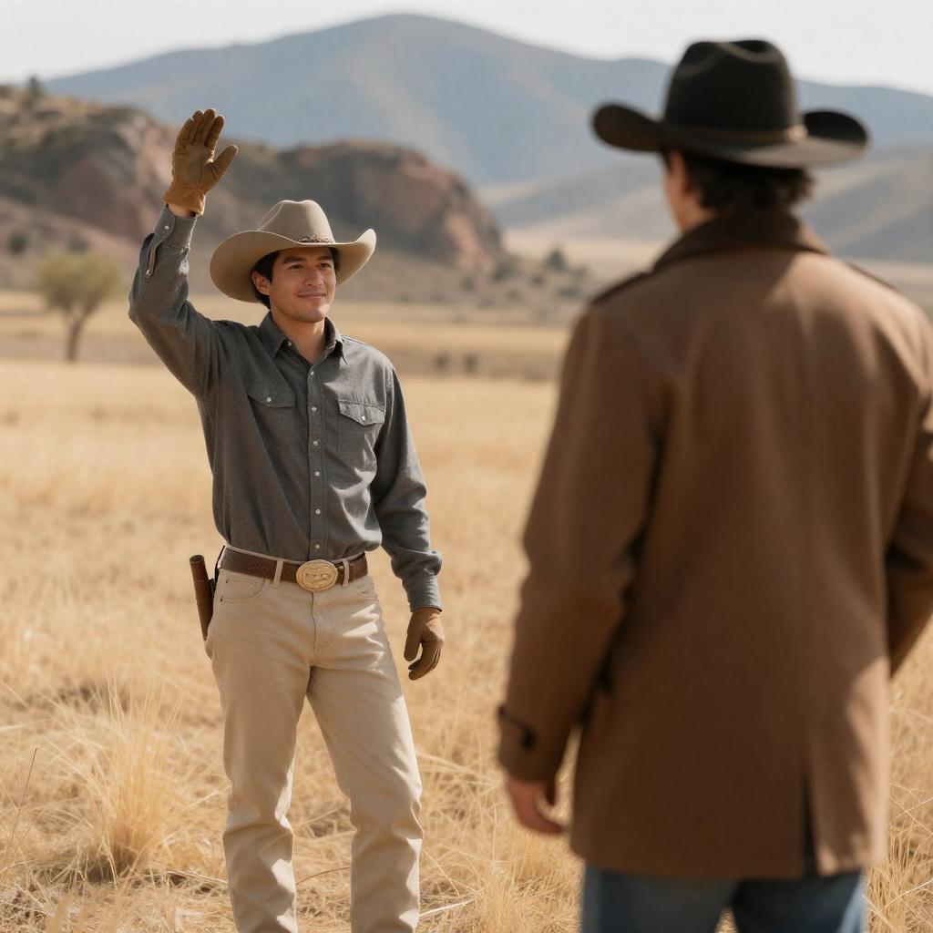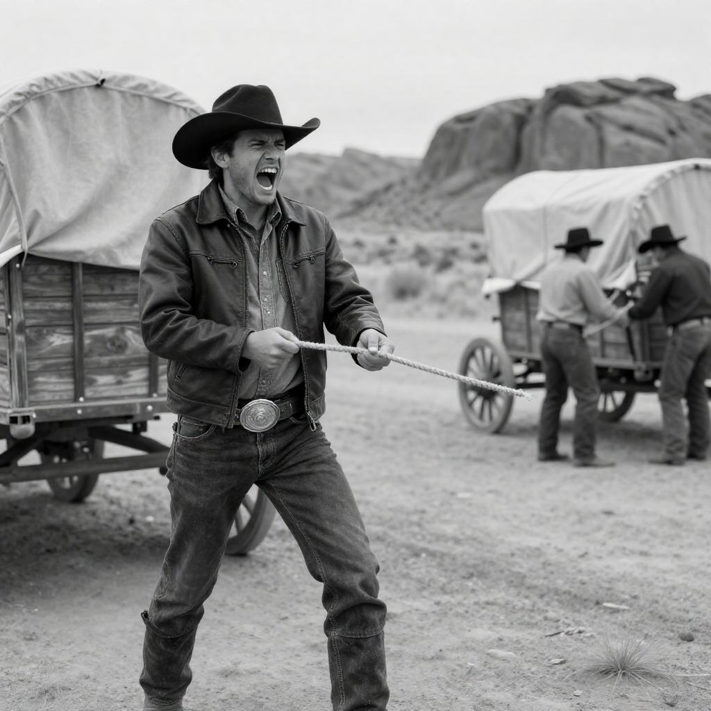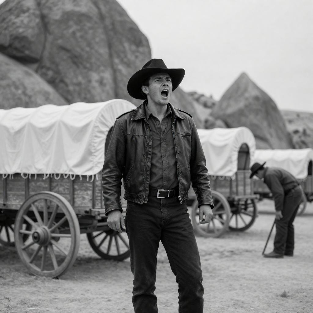 Black-and-white photograph of a man in a leather jacket, dark pants, and wide-brimmed hat, shouting with an open mouth. He stands in front of two covered wagons with large rock formations in the background. Another man, bent over, is in the background to the right. Multiple covered wagons and rocky terrain fill the scene.