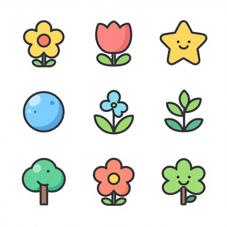 This is a digital illustration featuring a grid of nine cartoon-style flower and plant icons, arranged in a 3x3 pattern on a white background. The icons include a yellow flower with a red center, a pink tulip, a yellow star with a smile, a blue orb, a blue flower with green leaves, a green plant with two leaves, a red flower with a yellow center, a green tree, and a green flower with a brown stem. Each icon is outlined in black and uses bright, solid colors, giving a playful and child-friendly appearance.