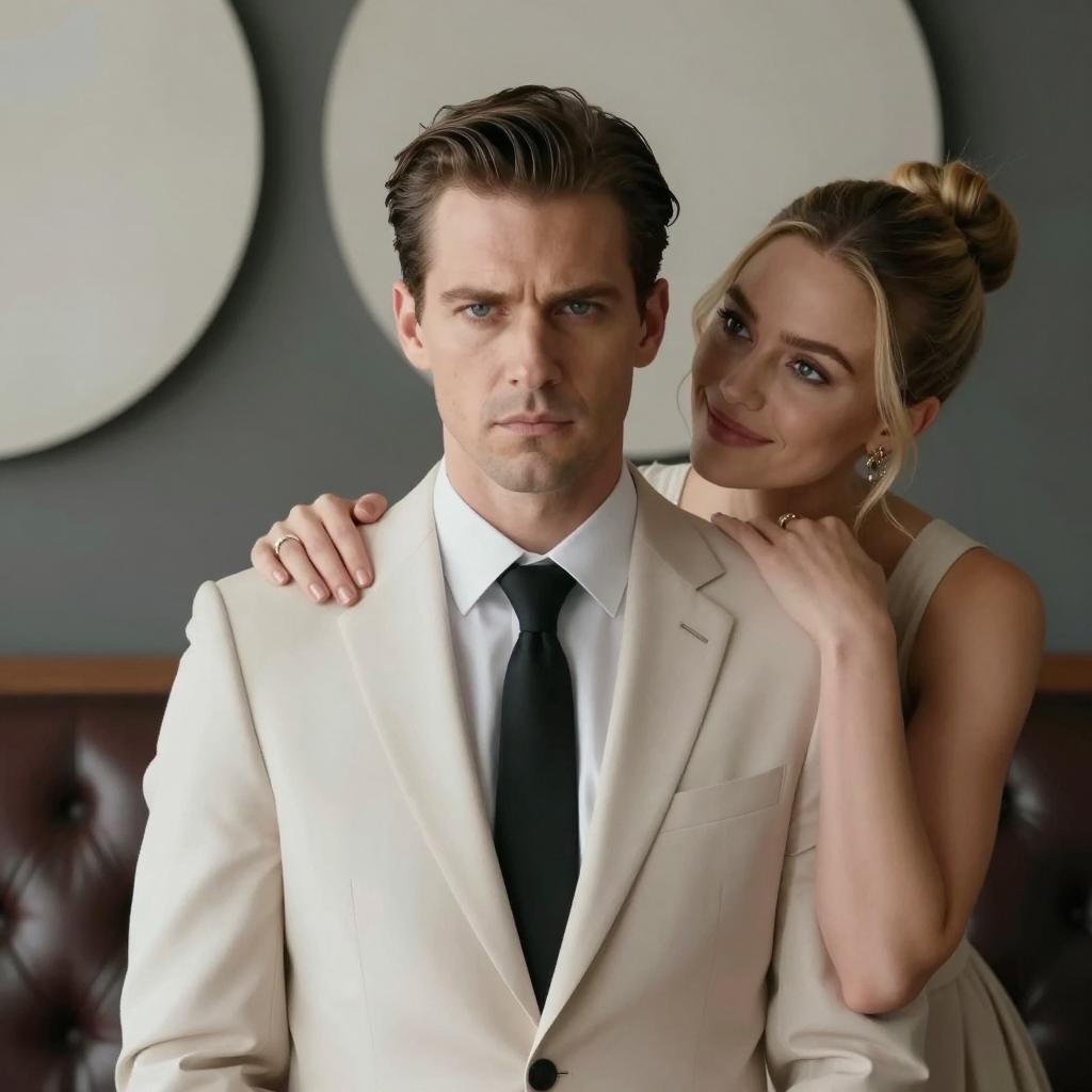 Portrait of a blonde woman wearing a green headband and plaid shirt holding a white mug, standing next to a man with dark hair in a black suit, white shirt, and gray tie. The man is pointing at the mug with an intense expression. The background shows a tree-lined urban street with blurred sidewalk and vehicles.
