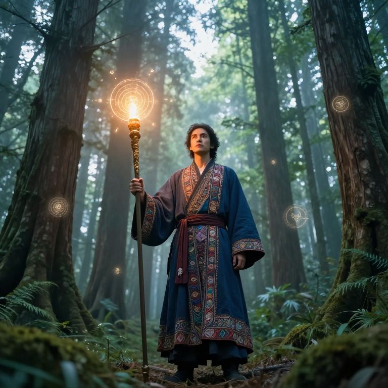 Photorealistic digital artwork of a young man with long, wavy brown hair and a fair complexion, standing confidently in a mystical forest. He wears a loose, white, flowing robe with wide sleeves and a dark brown belt. The forest is illuminated by glowing, bioluminescent mushrooms and small, twinkling lights. Tall trees with thick trunks and dense foliage create a magical atmosphere. The man's robe billows slightly, suggesting a gentle breeze. The background fades into a misty blue light, adding an ethereal quality to the scene. The overall mood is enchanting and otherworldly.