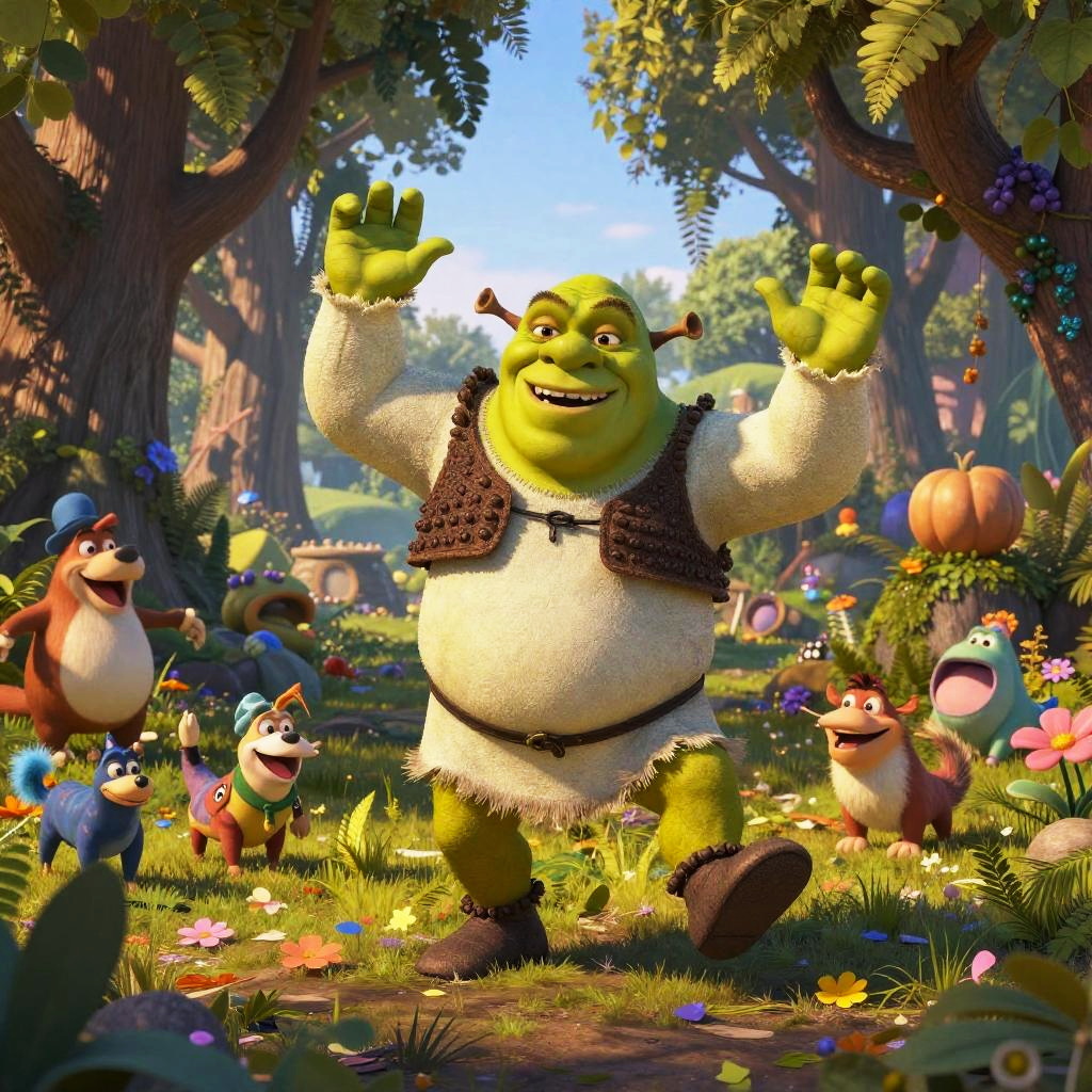 Goofy ah Shrek in a whimsical swamp setting, vibrant colors, cartoonish style, exaggerated features with a goofy grin, lush green background, humorous and playful atmosphere, fantasy forest elements, soft lighting