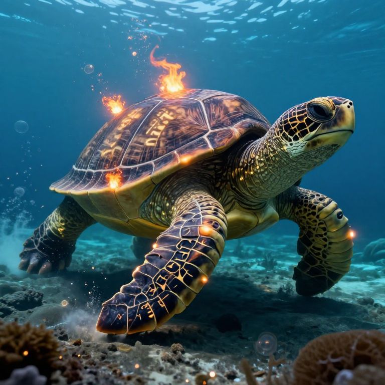 Enormous mechanical turtle strides gracefully across the ocean floor, its shell adorned with four fiery sparks that illuminate the surrounding seabed, while glowing plankton particles dance around its massive limbs, spelling out ancient, forgotten languages.