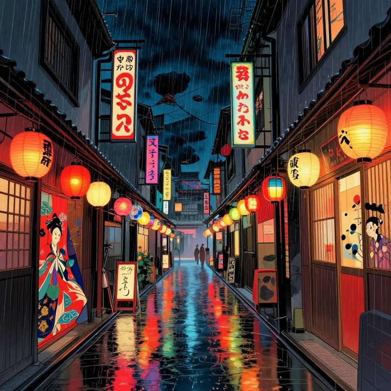 An atmospheric digital illustration depicts a serene, moonlit street lined with traditional buildings adorned with warm lanterns, evoking a cyberpunk-meets-retro aesthetic as figures gather beneath the ethereal glow of a massive, luminous moon, creating a dreamlike ambiance reminiscent of a marketplace suspended in twilight.