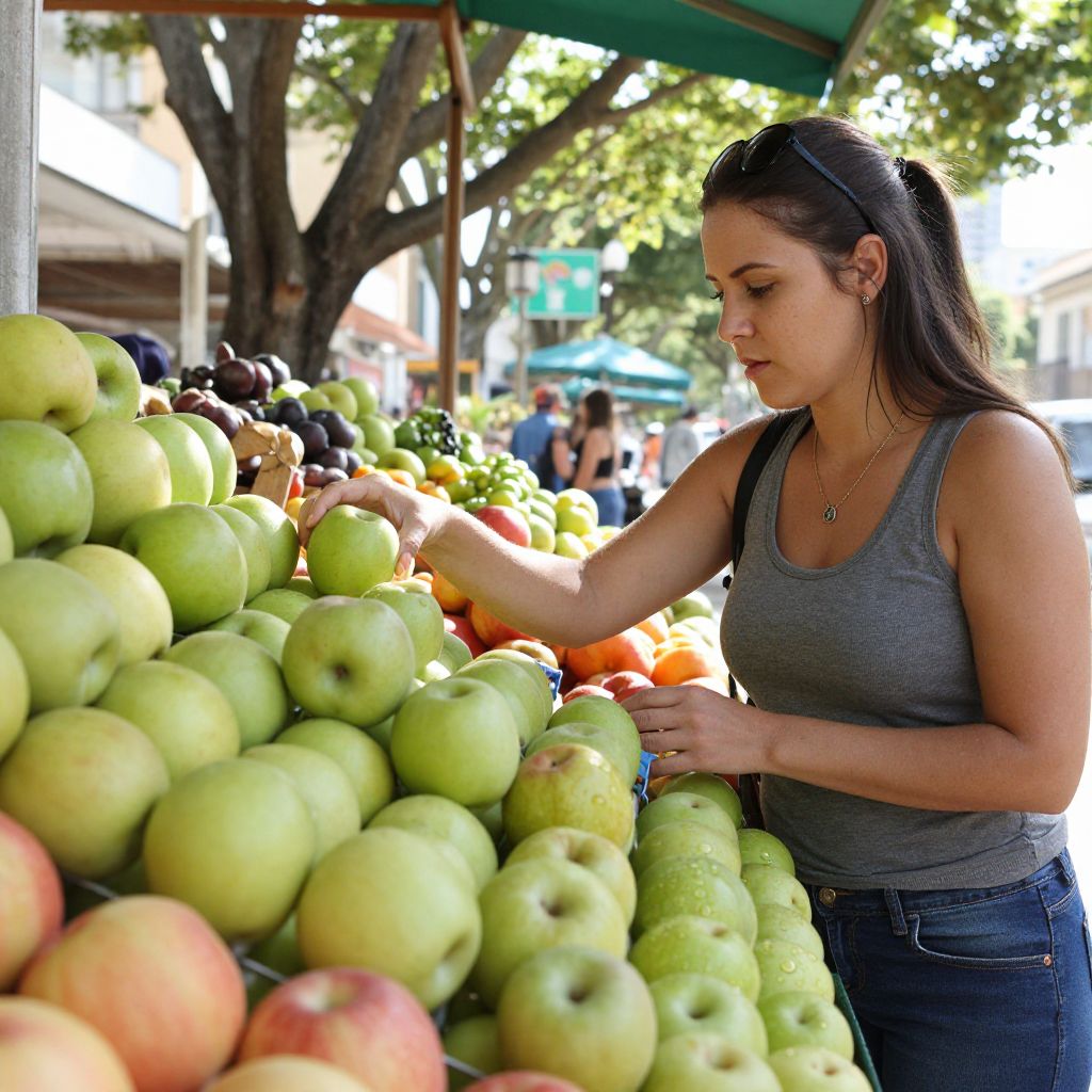 Woman selecting fresh green apples at a vibrant fruit stand under a sunny canopy in Belo Horizonte, Brazil, March 2014.