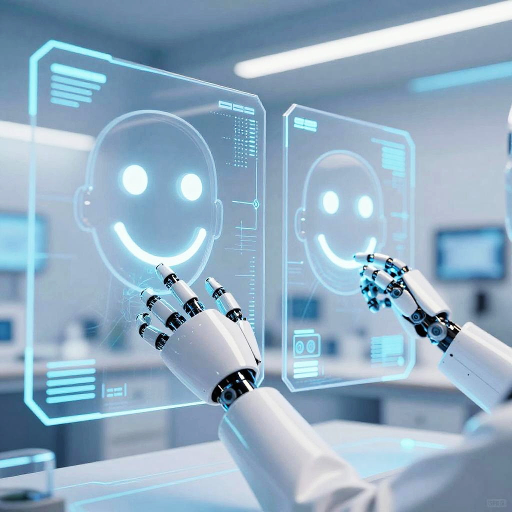 Ai smile generator in action, robot hands shaping smiling human faces on transparent screens, bright blue and white color scheme, futuristic technology theme, glowing data streams, ultra-modern interface, clean and detailed design