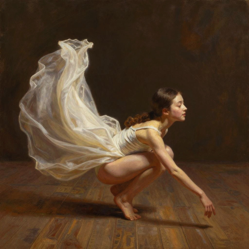 Crouching position of a young dancer on a vintage wooden floor under warm spotlight, elegant lines and flowing fabric in motion, emotion captured in a single breath, warm color palette, impressionistic painting style