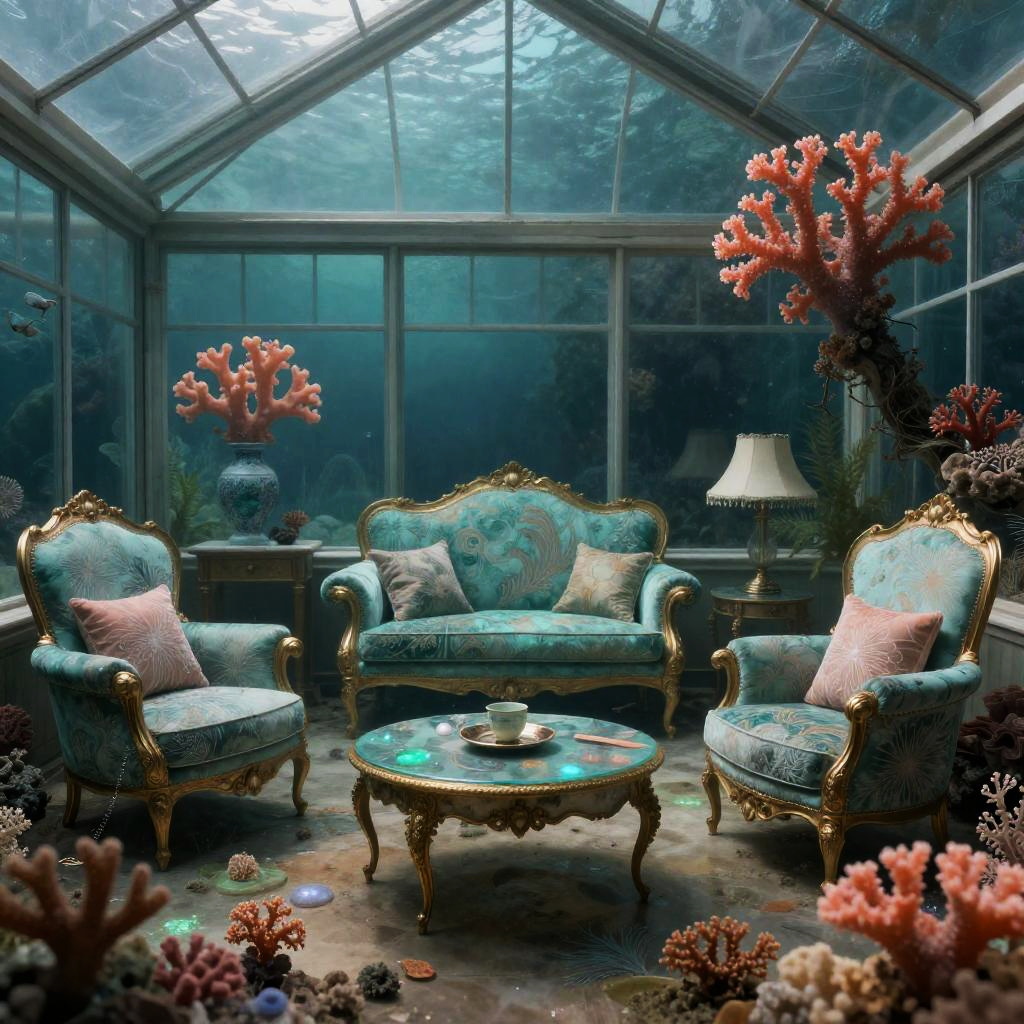 A collage illustrating a submerged conservatory filled with coral, drifting plants, and vintage furnishings adorned with bioluminescent teal and coral with pearlescent highlights. The artwork should embody an ethereal quality with rich textures, intricate linework, and luxurious furnishings, set against a dreamy, soft-focus background, influenced by luminous seascape drama inspired by Ivan Aivazovsky.