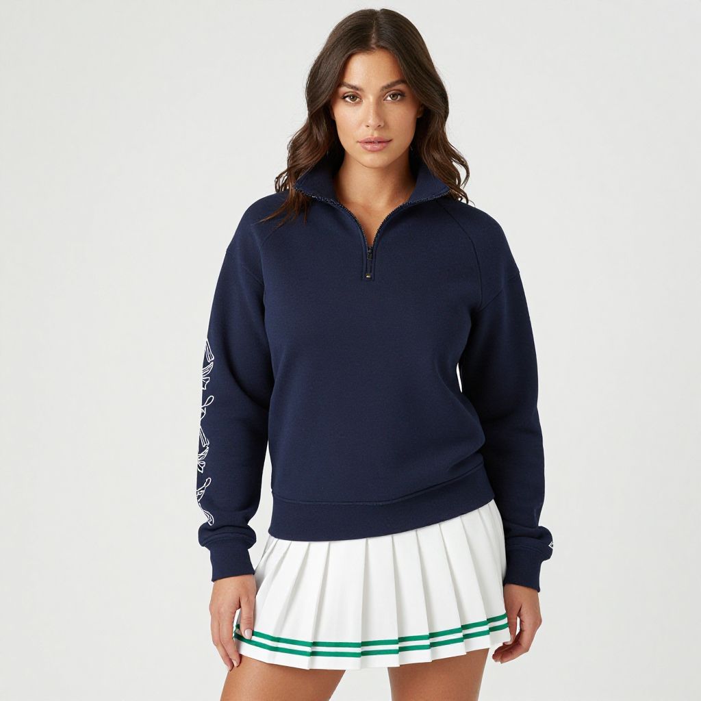 "Woman, casual sporty, navy blue quarter-zip sweatshirt, embroidered sleeve details in white, relaxed fit, layered over white pleated miniskirt with green horizontal stripe at the hem, standing pose, white studio background. Sexy. Pretty face and beаutiful eyes. Big breasts."