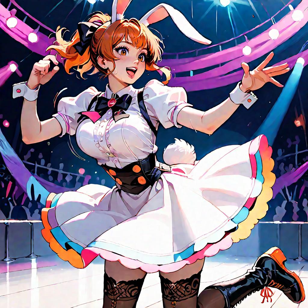 Score_9, score_8_up, score_7_up, source_anime, solo, concert, stage, standing, singing, microphone, stage lights, multicolored lighting, smile, looking at viewer, (sweat:0.8), mnsior, petite, longhair, brown hair, forehead, brown eyes, hairband, small breasts, idol costume, pink dress, satin, lace trim, detached sleeves, bare shoulders, boots, thigh strap