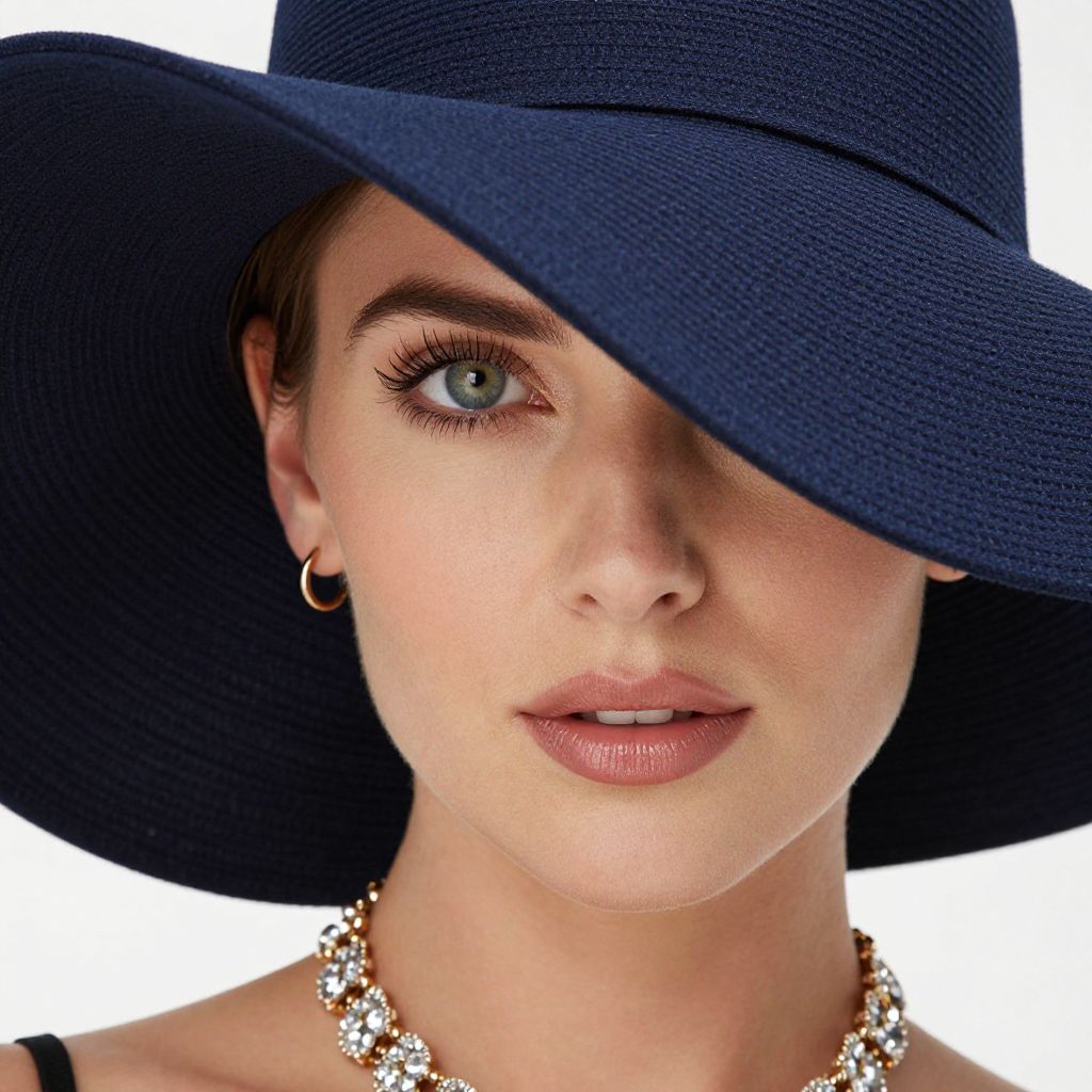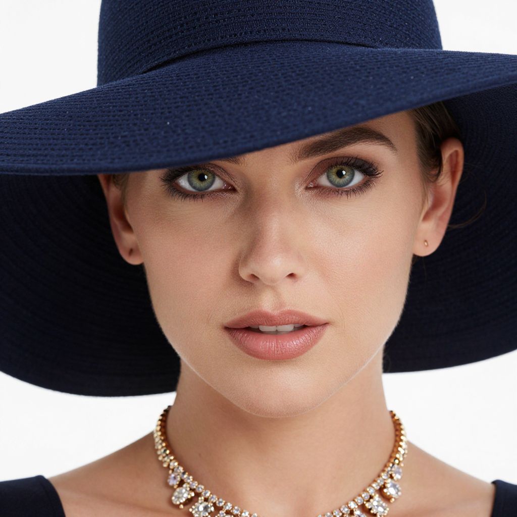 Photograph of a fair-skinned woman with blue eyes, wearing a dark blue, wide-brimmed hat that partially covers her right eye. She has brown hair, subtle makeup, and glossy pink lipstick. She wears small gold hoop earrings and a necklace with large, sparkling gemstones. The background is plain white, emphasizing her face and hat. The hat's texture is slightly rough, contrasting with her smooth skin. The overall style is elegant and sophisticated. The image focuses closely on her face and upper shoulders.