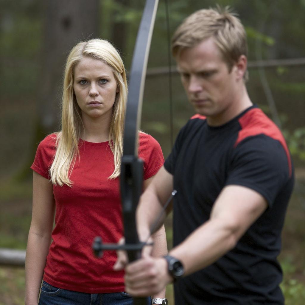 Photograph of two people in a forest. Blonde woman with long hair, red shirt, serious expression, standing behind. Blonde man with short hair, black shirt with red shoulder, holding bow, focused expression. Blurred trees and foliage background.