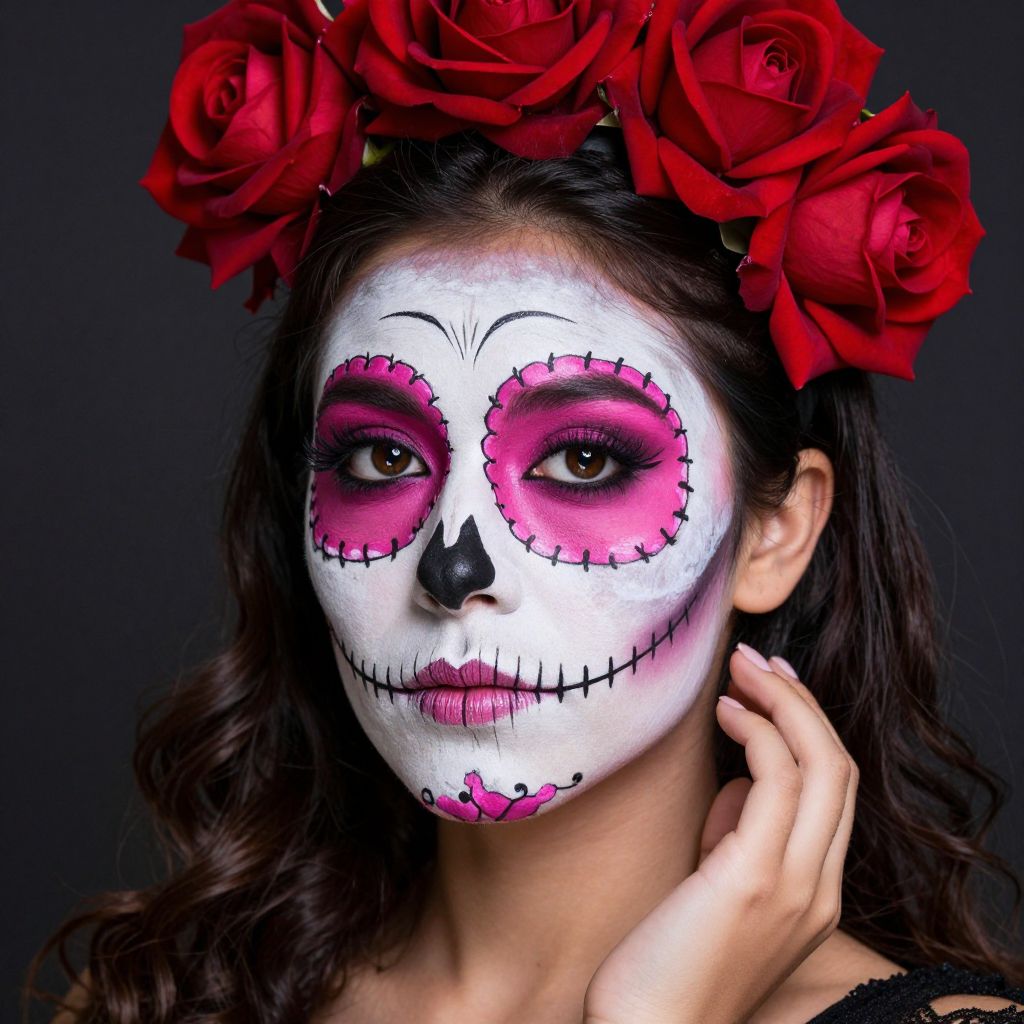 Woman showcasing intricate sugar skull makeup with bold pink accents, black stitching details, and two vibrant red roses adorning her hair, embodying a festive and artistic Day of the Dead-inspired look.
