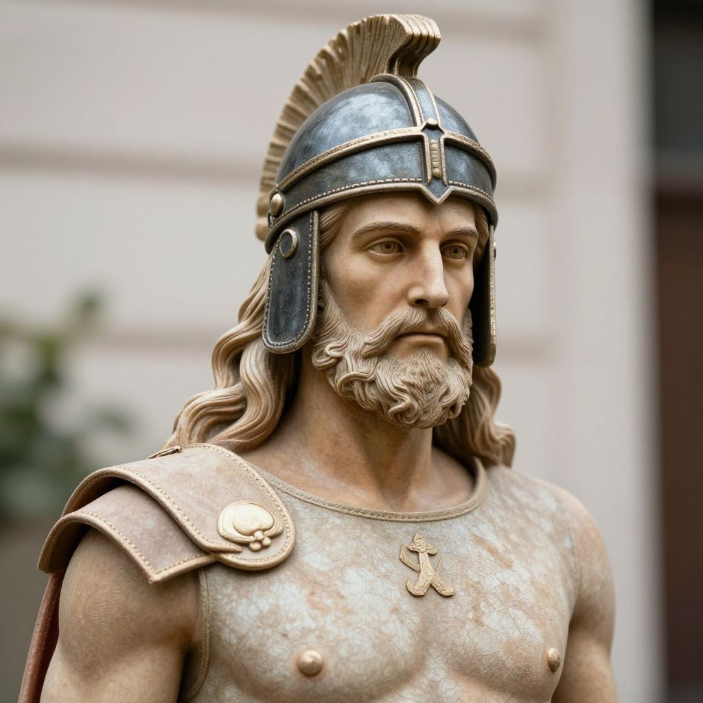 Photorealistic statue of a muscular, bearded ancient Greek warrior with a metallic helmet and shoulder armor, featuring a detailed crest and cross necklace. Bl