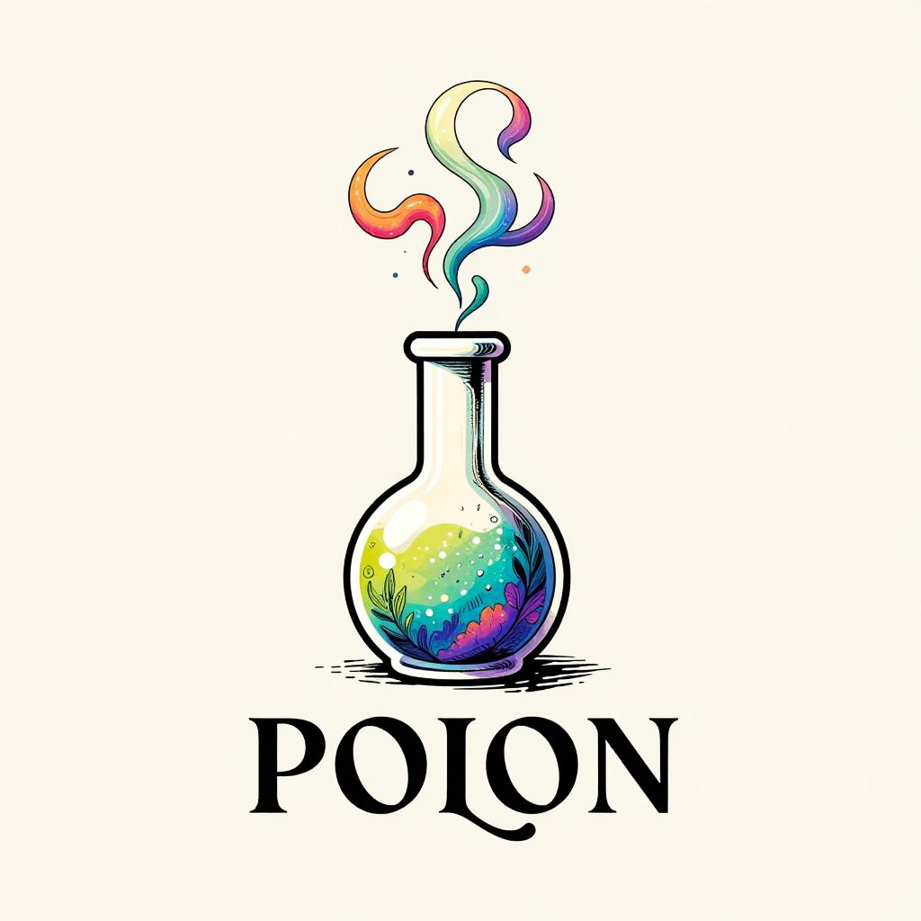 Potion logo with a whimsical enchanted flask emitting colorful smoke, medieval fantasy style, elegant serif lettering, hand-drawn look, vibrant mystical atmosphere