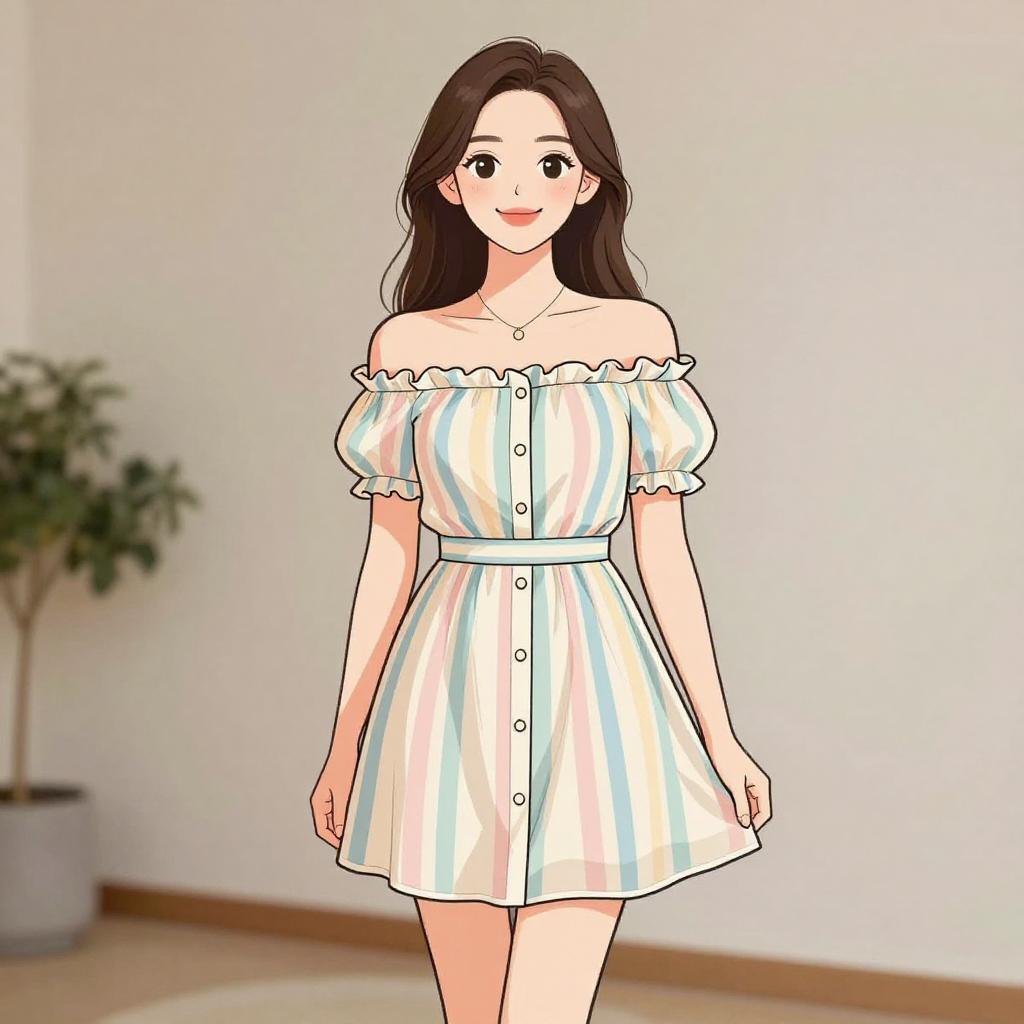 Woman with pretty face and pretty hair. smiling Woman, summer casual, off-the-shoulder mini dress with pastel stripes, ruffled neckline, short puff sleeves, front button closure, A-line skirt, sheer fabric, delicate necklace, indoor plain background. --sref 1467