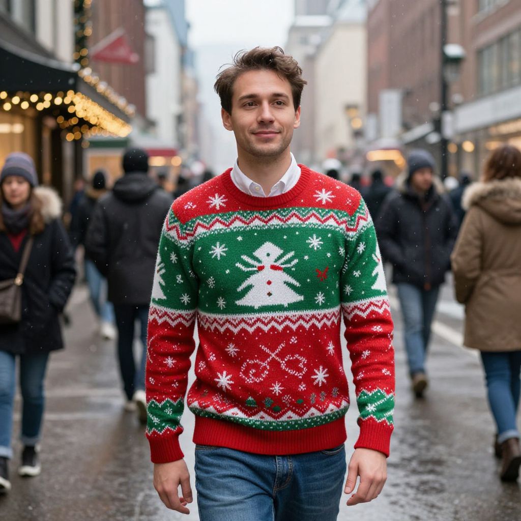 A man with short brown hair, wearing a cozy red and green Christmas sweater with a white button-down shirt and blue jeans, stands on a busy city street during the holiday season. The background shows a lively scene with other people walking, shopping, and enjoying the festive atmosphere, with snow gently falling and festive lights illuminating the storefronts. The man has a warm, friendly expression, and the overall mood is joyful and cozy, capturing the spirit of Christmas in an urban setting.