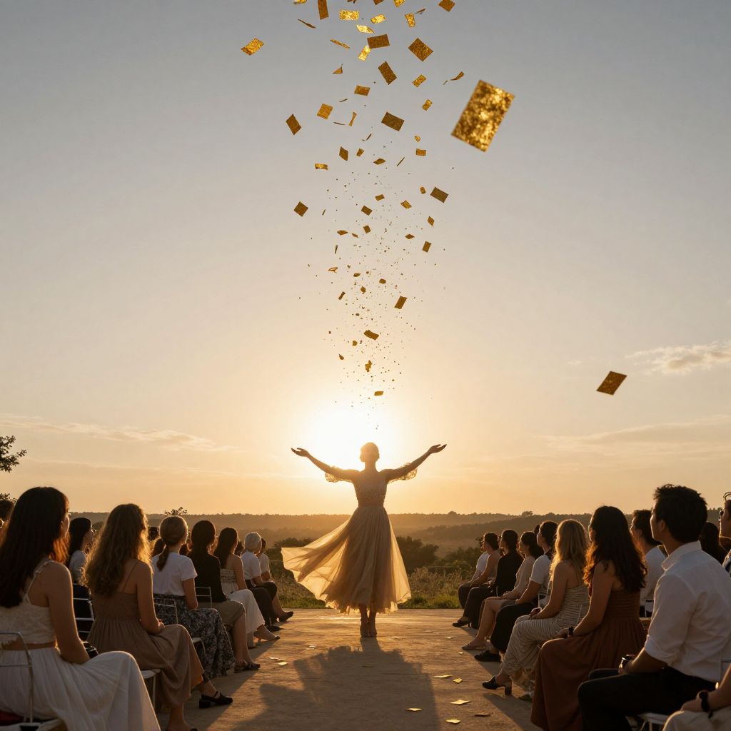 Photograph of a woman in a flowing dress, silhouette against sunset, arms raised, golden cards flying upward, audience seated in rows.