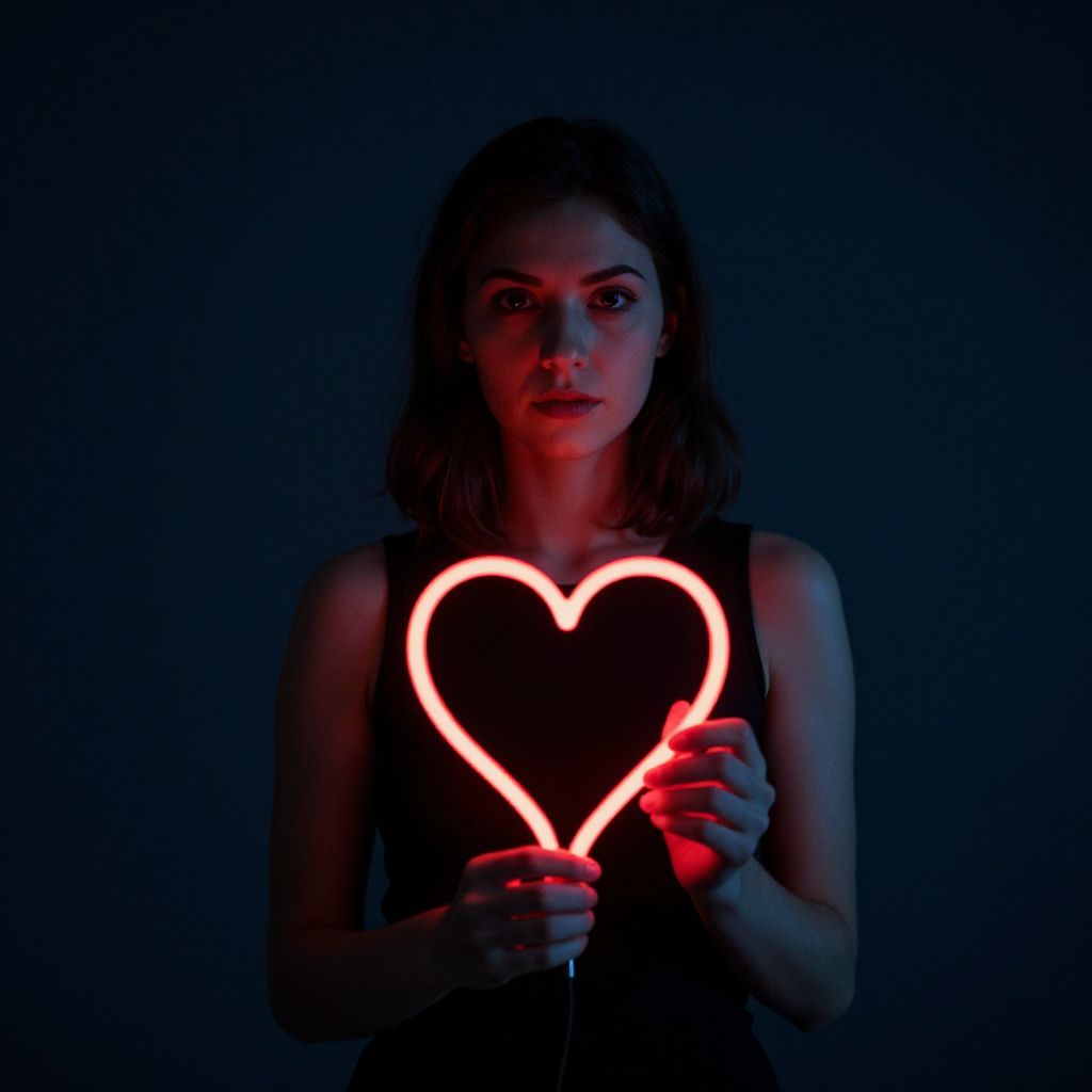 Photograph of a young woman with fair skin and wavy brown hair, standing against a dark blue background. She is holding a neon heart-shaped light, which glows brightly in red. She wears a sleeveless black top, and her expression is neutral, with slightly parted lips. The neon light casts a soft red glow on her face and chest, contrasting with the dark surroundings. Her hands grip the light, centered in the frame, with the heart shape clearly visible. The overall mood is mysterious and slightly romantic, emphasized by the dramatic lighting and dark background.
