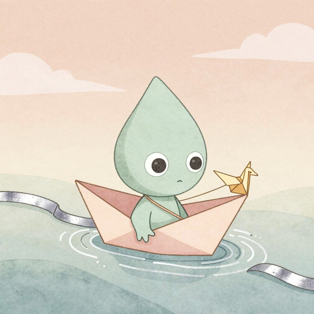 A small whimsical alien character with a large teardrop-shaped head and big round eyes gently collecting glowing dewdrops in tiny glass jars while perched on interconnected floating pastel lily pads, a tiny moth companion resting on its shoulder, gentle watercolor style with muted pastel colors and simple shapes, soft gradient sky with faint clouds, storybook illustration style, soft mauve, seafoam, and pale amber with hints of pearlescent silver