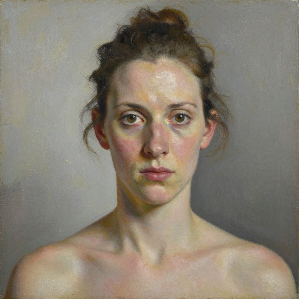 A detailed and realistic oil painting portrait of a young woman with fair skin, brown hair tied back, and green eyes. The subject is depicted from the shoulders up against a neutral gray background, emphasizing natural skin tones and subtle shading. This artwork reflects Lucian Freud's characteristic style of intense realism and psychological depth.
