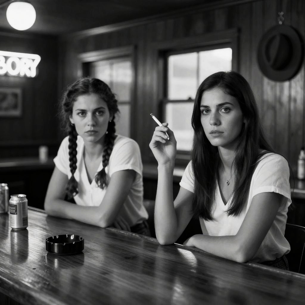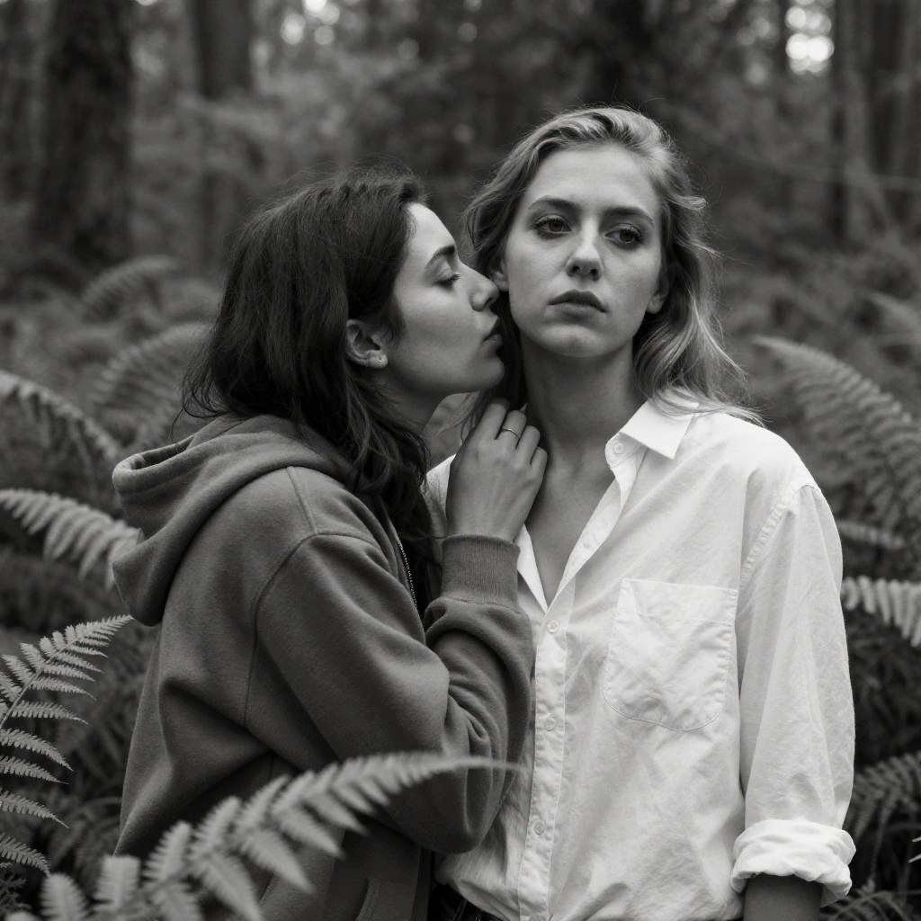 Black and white photograph of two women in a forest. Woman on left has dark hair, wears a hoodie, kisses neck of woman on right. Woman on right has light hair, open shirt, looks ahead. Ferns in foreground, trees in background.