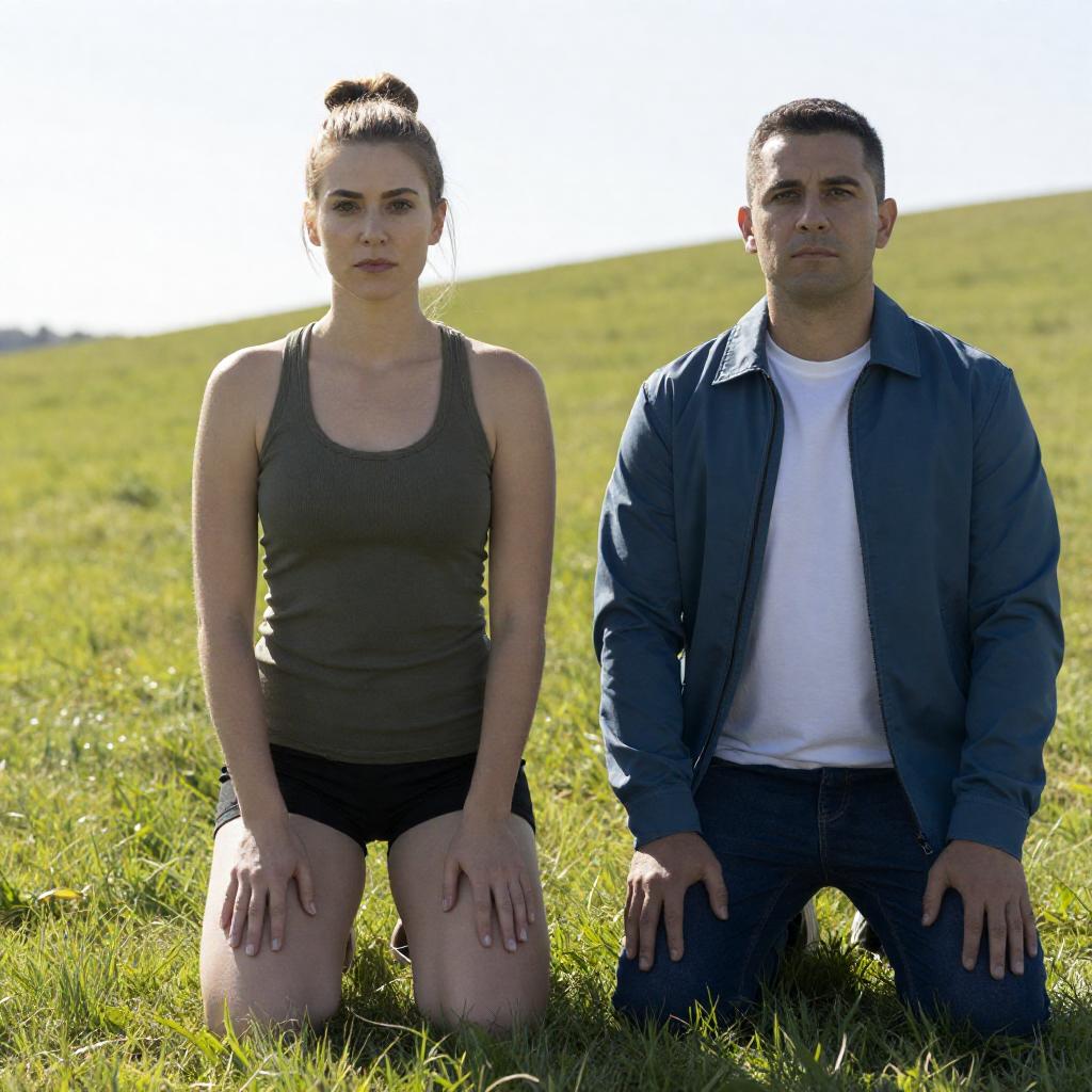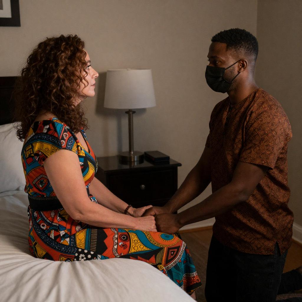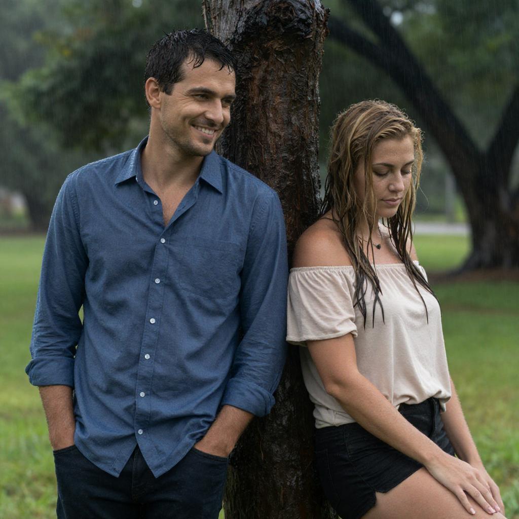 Photograph of two people sitting on a weathered wooden porch. Black man with short hair, gray shirt, and gray pants crouches, looking down. Blonde woman with curly hair, white dress, barefoot, sitting with legs apart, looking upward. Rusty wooden bench and small dog on porch. Peeling gray wooden wall background.