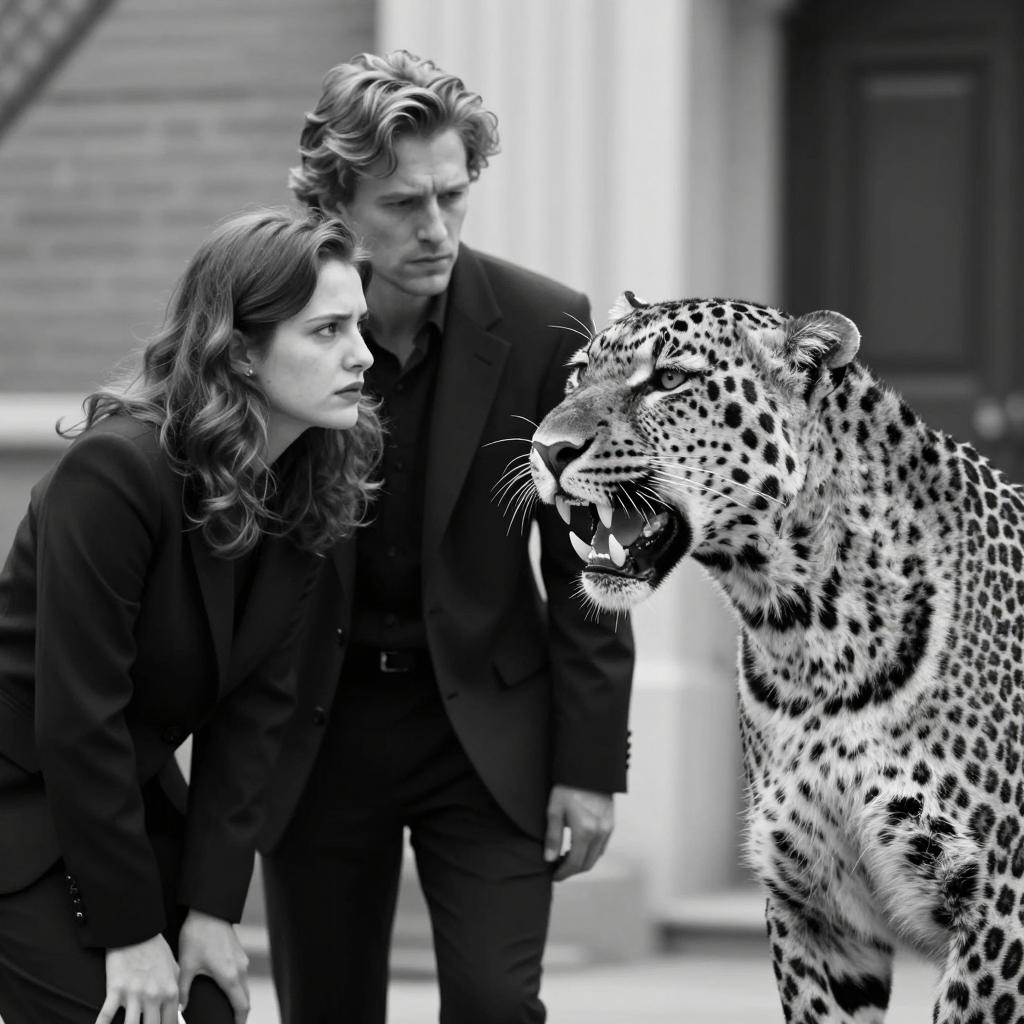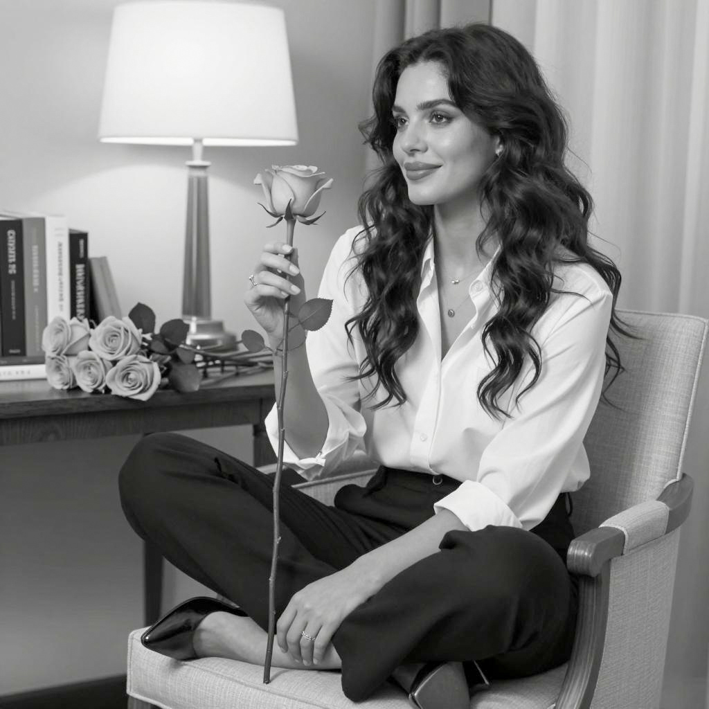 Black and white photograph of a woman with wavy dark hair wearing a sheer, polka-dotted blouse. She holds a phone to her ear with her right hand, eyes closed. In her lap is a leopard-patterned dog. Background includes a table with flowers, a lamp, and a window with curtains. Woman's left hand rests on the dog's back. Lamp and table on the right, flowers on the left. Woman's facial expression is calm. One person, one dog.