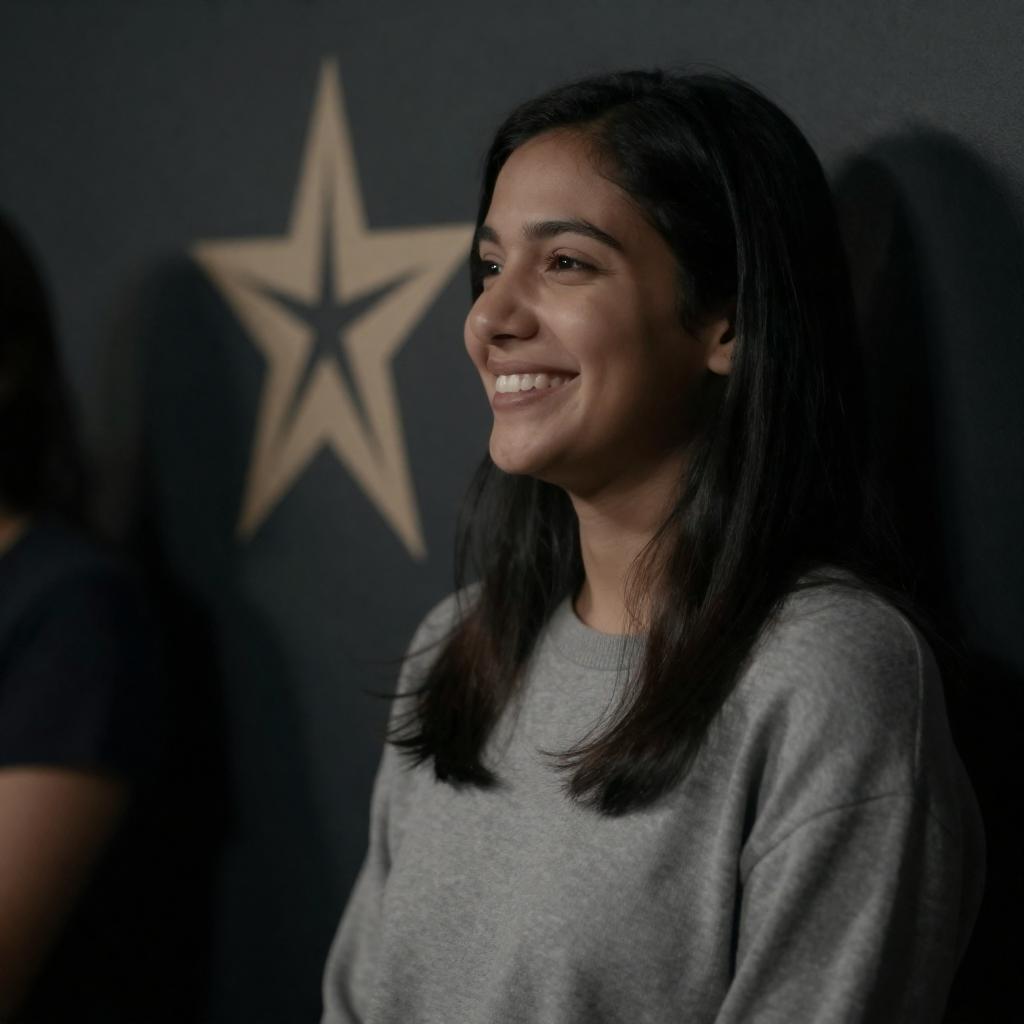 Photograph of a young woman with light skin and straight black hair in a ponytail, wearing a pink "Chiefs" t-shirt. She stands outdoors against a blurred green tree background, smiling slightly. The grassy field is visible in the foreground.