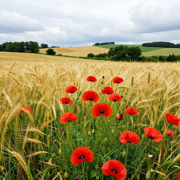 Vibrant red poppies bloom densely across a golden wheat field, surrounded by lush green foliage and framed by a serene landscape of rolling hills, scattered trees, and a partly cloudy sky near Argenteuil.