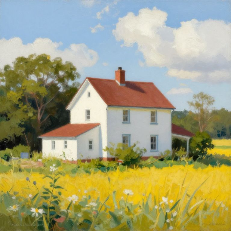 Photorealistic painting of a white, two-story house with red roof, surrounded by vibrant yellow wildflowers and lush greenery, under a bright blue