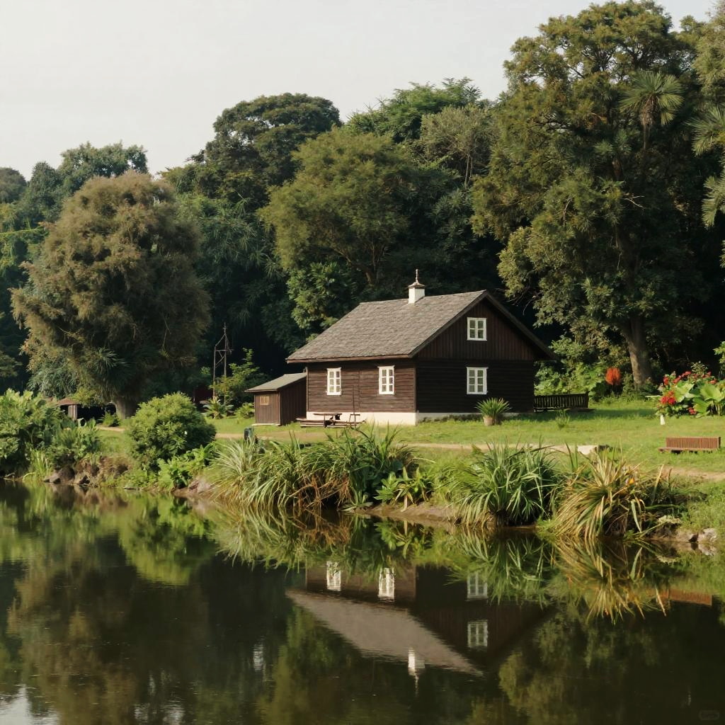 This photograph depicts a quaint, dark brown wooden house with a gray shingled roof, nestled beside a calm, reflective pond. The house is surrounded by lush greenery and tall, dense trees in the background, creating a serene, natural setting. In the foreground, tall grasses and various plants line the edge of the pond, with their reflections visible in the water. The house features white-framed windows and a small chimney. On the right side, a vibrant red flower bush adds a pop of color. The overall scene is bathed in soft, natural light, enhancing the tranquil, rural atmosphere.