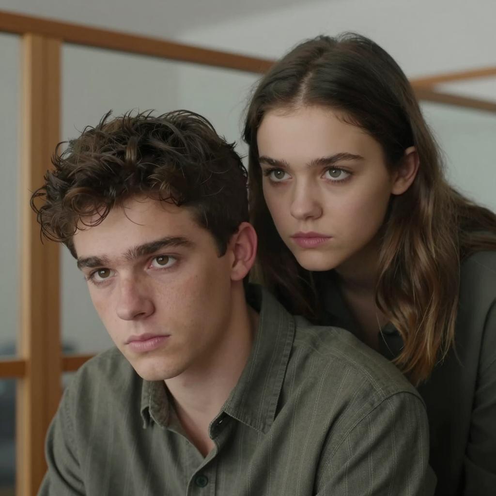 Digital composite. Two young men with short brown hair, one smiling, one with a serious expression. The smiling man wears a green shirt, the serious man wears a gray sleeveless shirt. Both have light skin. In the background, a dark, ured hill. On the left, a small inset of a man in a blue suit and helmet standing on wings, glowing with a yellow halo. Both men are in the foreground, partially overlapping.