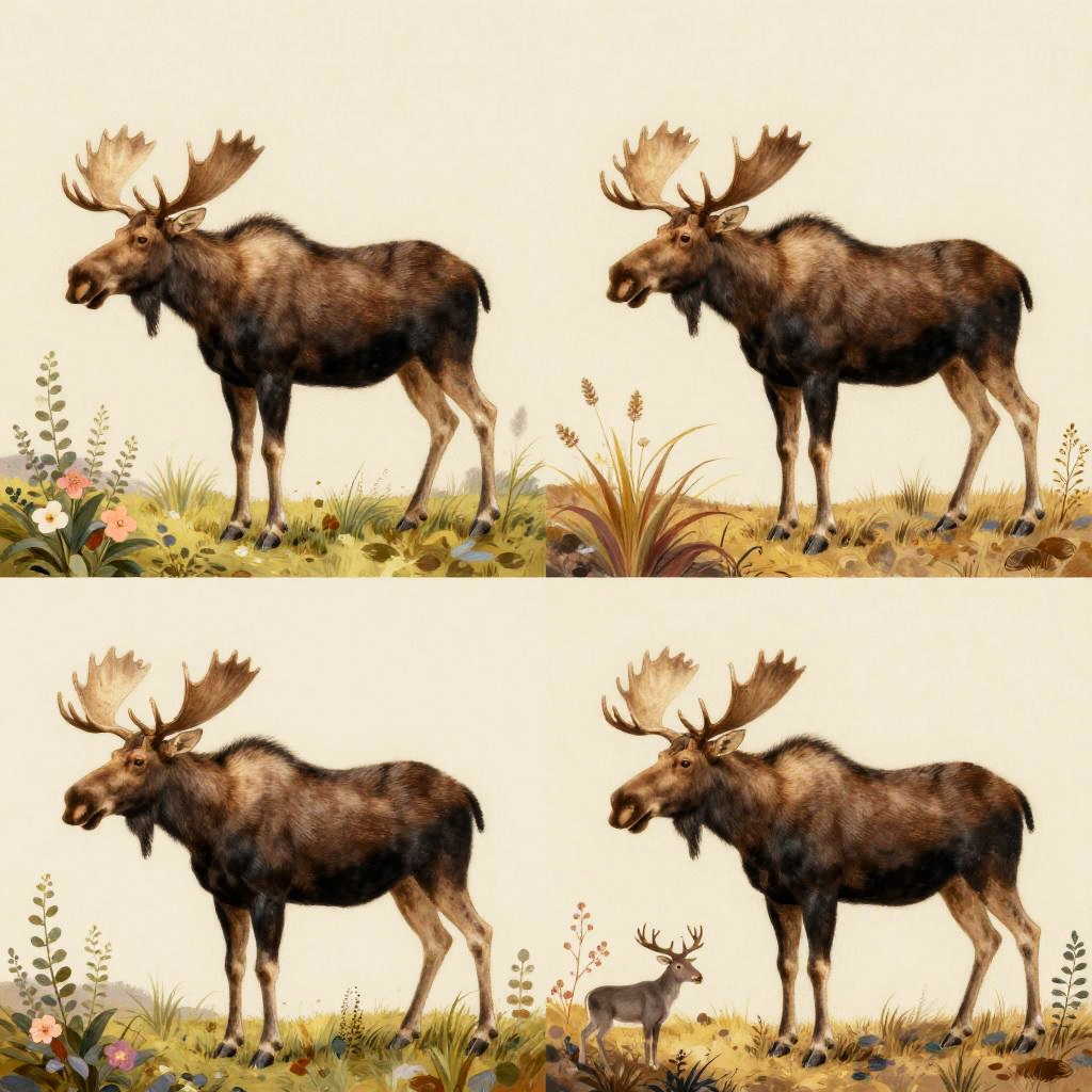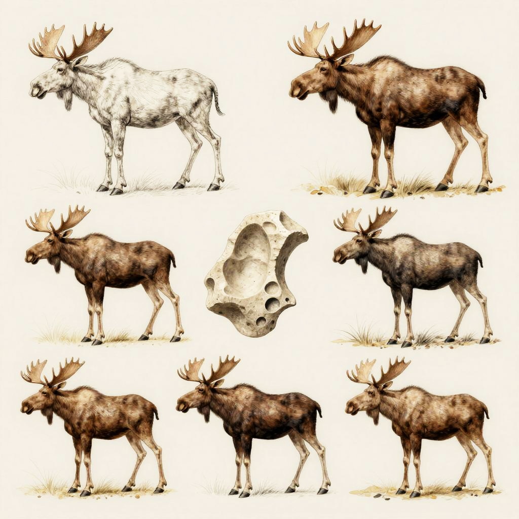 Moose evolution illustrated in a scientific style, fossil sketches transitioning into living moose in their habitats, subtle earth tones, intricate anatomical details, museum exhibit aesthetic