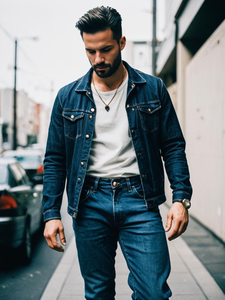 Man in Stylish Jeans Outfit, cinematic realism, lifestyle editorial photo