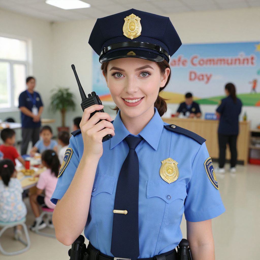 A lifestyle-style photo of a female cop cosplay character in a community center during a public safety event, wearing a bright, cheerful police uniform with a badge, holding a walkie-talkie, her face is friendly with a warm smile, clear green eyes, and natural makeup, the environment includes children, volunteers, and a large banner saying 'Safe Community Day'
