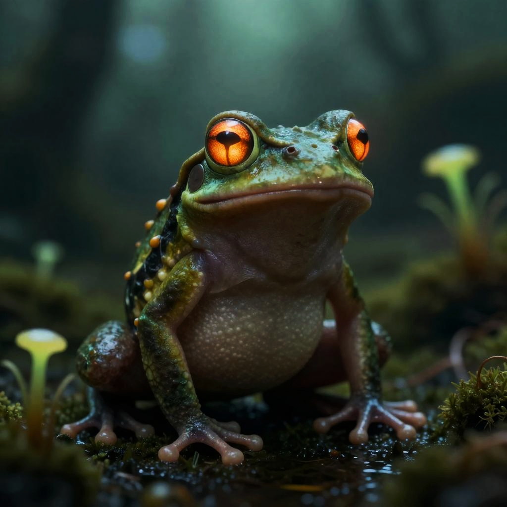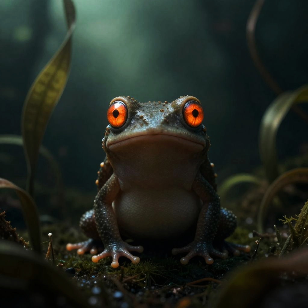 A small fantasy amphibian-like creature with large glowing orange eyes, standing among tall underwater plants in a dark, misty swamp, cinematic lighting highlighting its textured skin, moody atmosphere with dark green and brown color tones, mysterious and immersive environment
