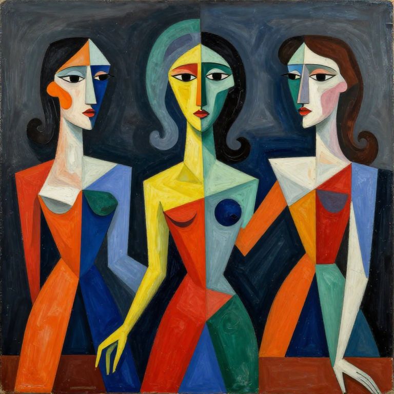 Bold, abstract painting of three stylized women with geometric faces, colorful dresses, and split-color backgrounds, standing closely together.