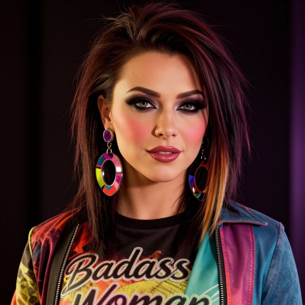 Photograph of a woman with a punk-inspired look against a dark background. She has shoulder-length, spiky brown hair with highlights, heavy black eyeliner, and dark red lipstick. She wears colorful, geometric, triangular earrings and a rainbow-patterned shirt with "Badas Woman" text. A blue strap is visible over her shoulder. Her makeup is bold, with pink blush and dark eyeshadow. The image has a bright, vivid color contrast with a focus on her face and upper torso. The background is solid black, making the subject stand out prominently.