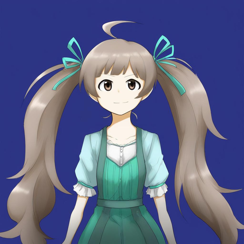 Digital illustration of a young anime girl with very long brown twintails tied with blue ribbons, brown eyes, and an ahoge hairstyle feature. She is wearing a light blue sleeveless dress with ruffles and lace details, posed against a soft gradient background.