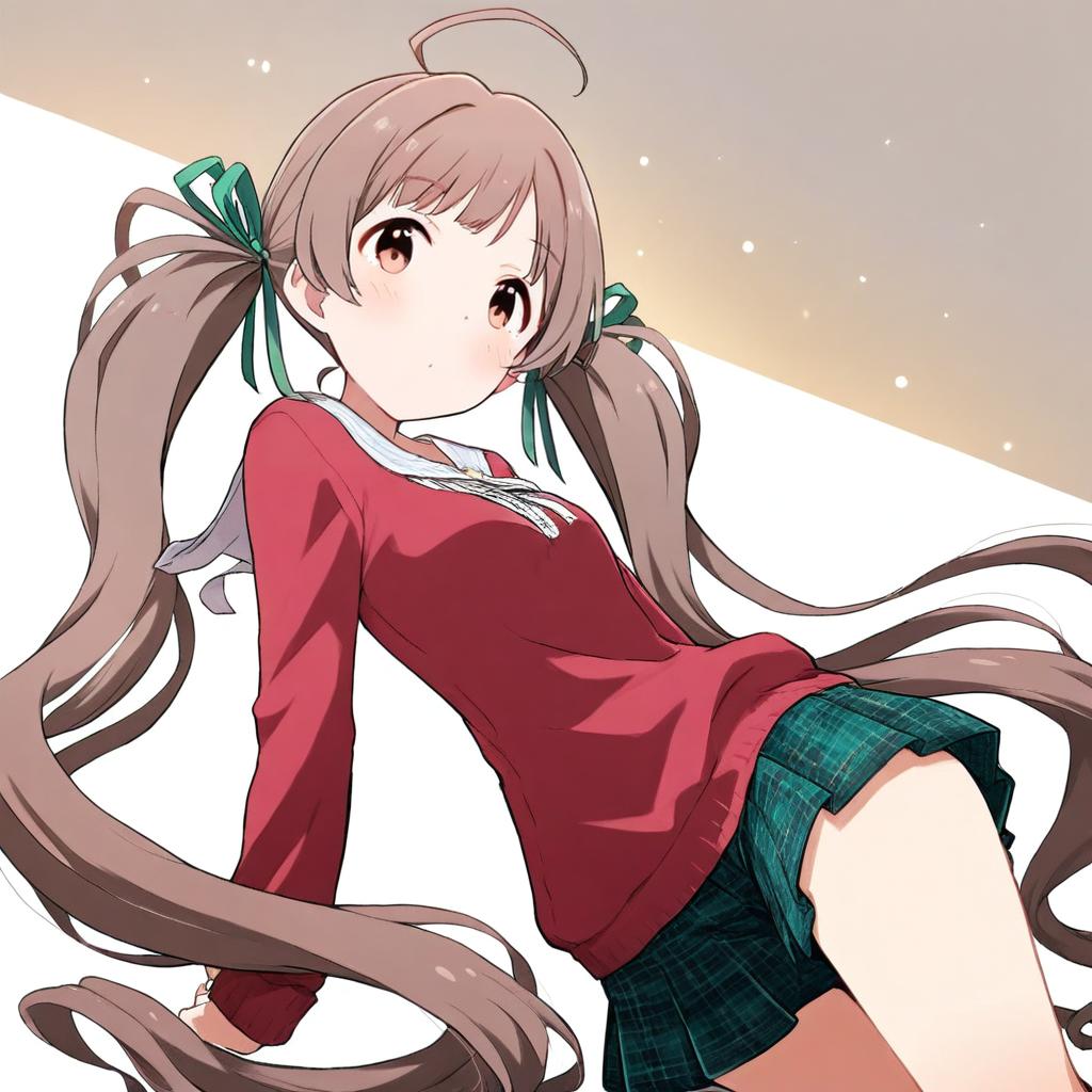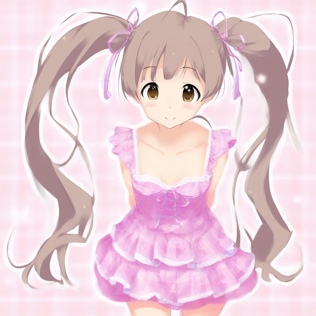Hakozaki serika, idolmaster, 1girl, brown eyes, brown hair, very long hair, long hair, twintails, ahoge, hair ribbon, small breasts, by artist mawaru (mawaru), leet