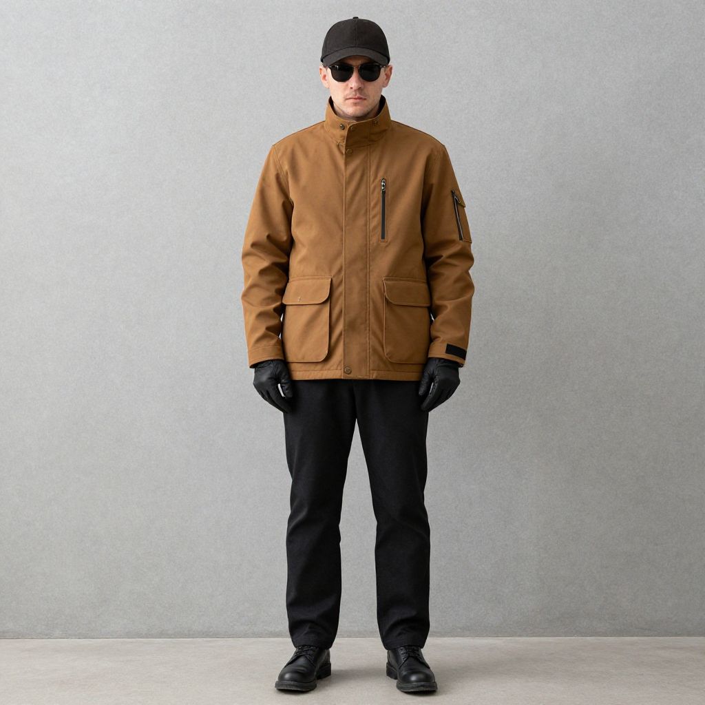 Man wearing a brown jacket, black gloves, black pants and black shoes. He has a hat on his head and sunglasses on his face.