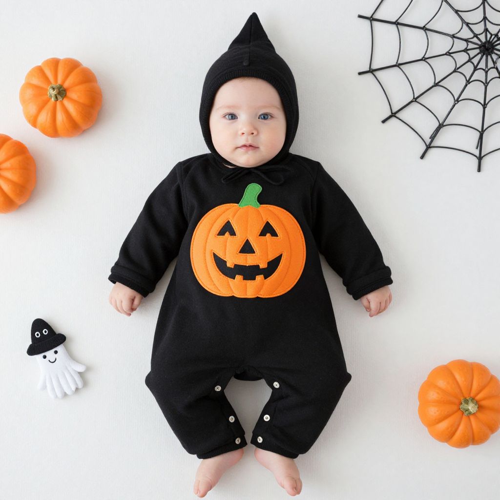 Photograph of a baby lying on a white surface, wearing a black Halloween-themed onesie with a large orange pumpkin graphic on the chest and a black cone-shaped hat. The baby's blue eyes and fair skin are visible. Surrounding the baby are four orange pumpkins and a small black and white witch hat. A black spiderweb is in the top right corner. The baby's feet are bare, and the onesie has button closures at the crotch. The image has a bright, clean, and festive Halloween theme.