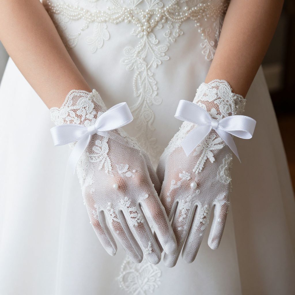 Elegant white beaded lace bridal gloves adorned with a delicate bow-knot gracefully adorn a woman's hands, complementing her wedding attire as a sophisticated accessory for the special day.