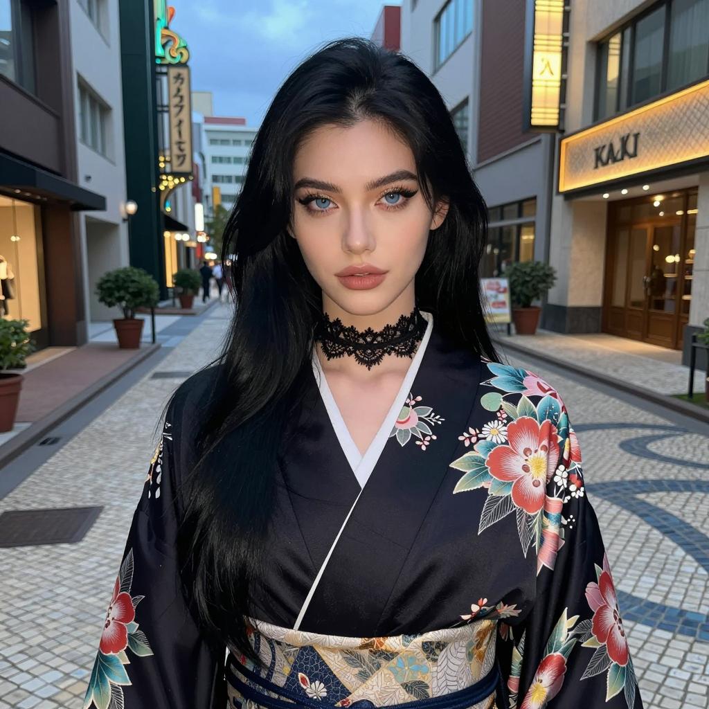 Portrait of a beautiful woman with long black hair and blue eyes wearing a black lace choker and a silk kimono decorated with intricate floral patterns. She stands on a mosaic cobblestone street in an art deco-inspired urban setting during dusk, surrounded by illuminated buildings and storefronts.