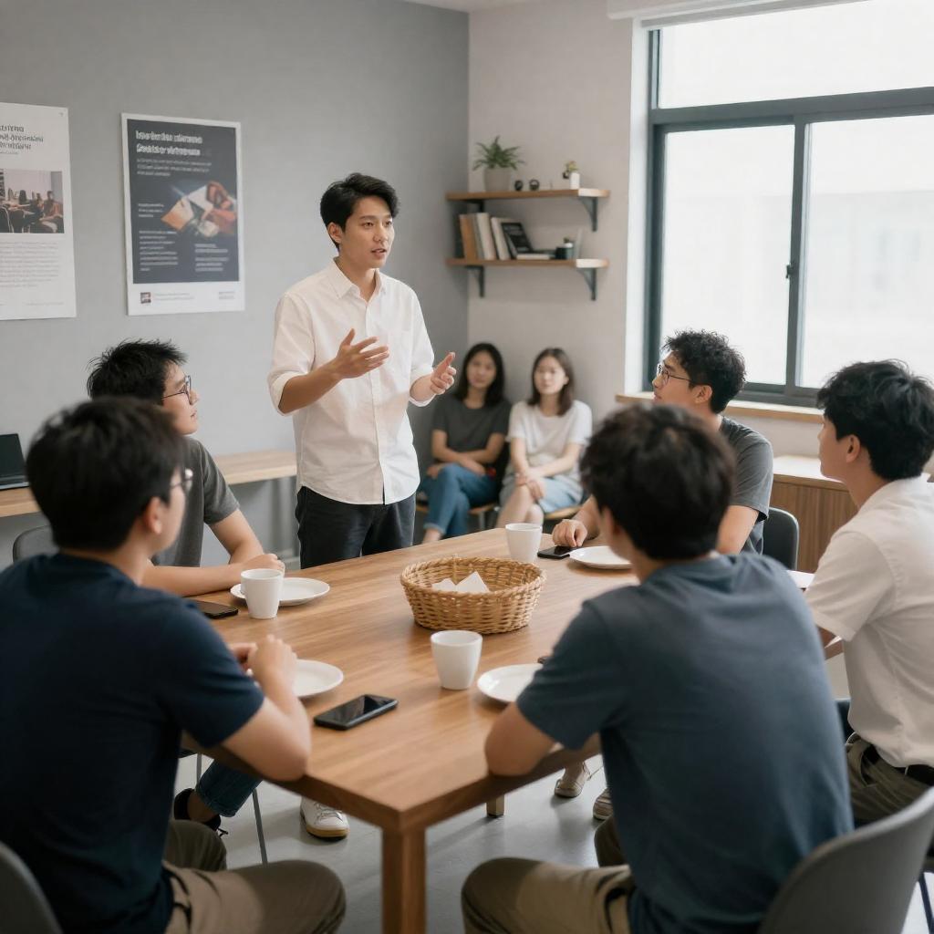 Photograph of a diverse group of people at a concert. Foreground: chubby Asian man with black hair, open mouth, beige jacket, white shirt. Right: Asian man with raised hand, striped shirt, blue vest, shouting. Background: smiling, cheering crowd. Dim lighting.