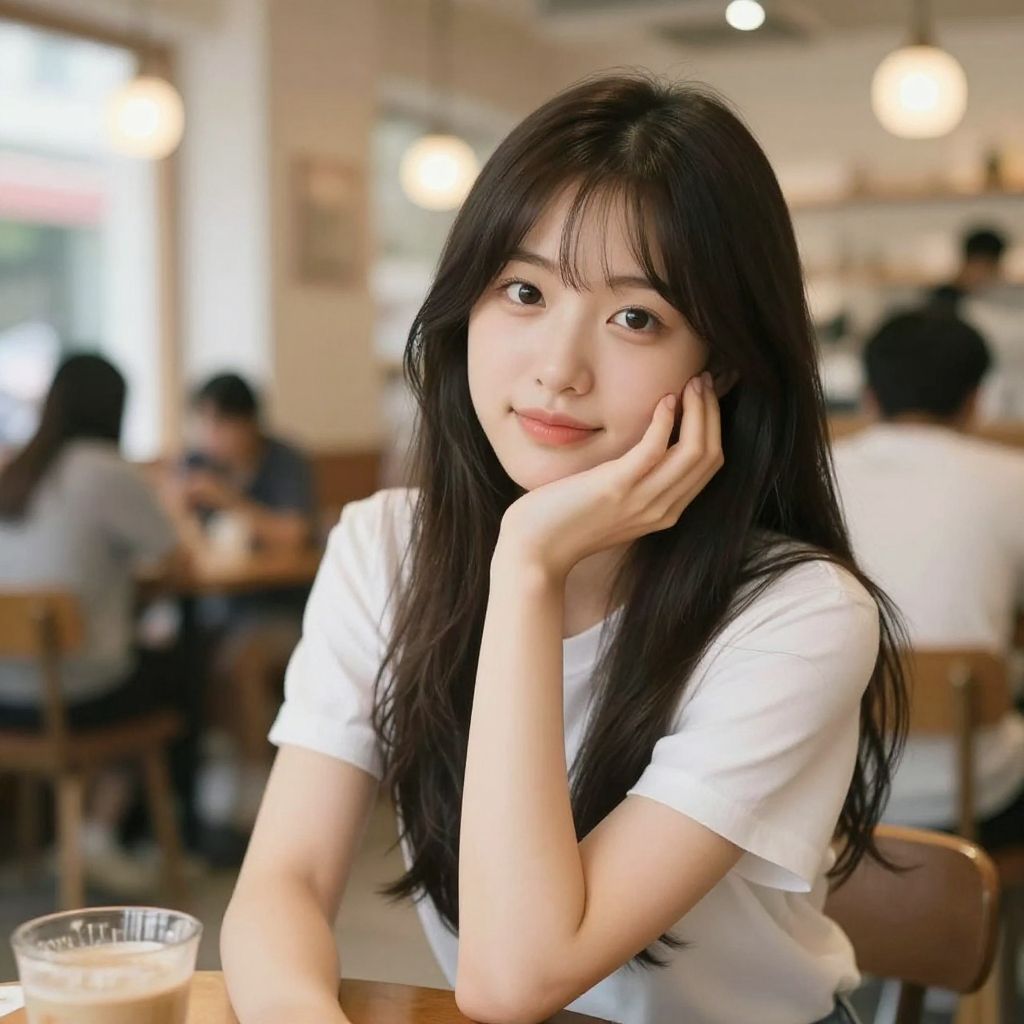 Photograph of an Asian woman with long, straight black hair and fair skin, wearing a plain white t-shirt, sitting at a wooden table in a softly lit café. She rests her right cheek on her hand, smiling gently. In the background, blurred patrons sit at other tables, and warm, hanging lights illuminate the space. A glass of water is visible on the table in the foreground. The overall atmosphere is cozy and casual.